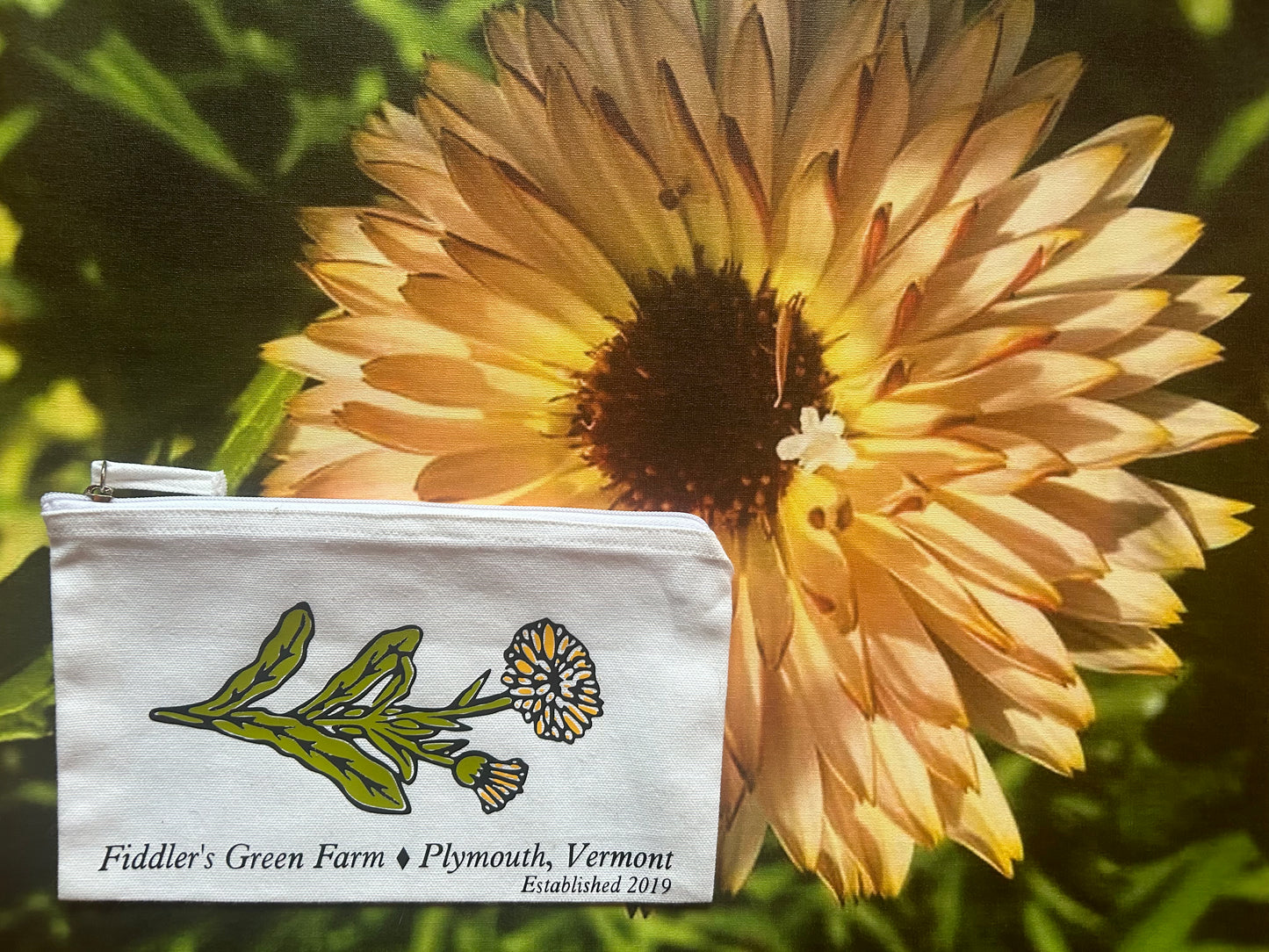 Small canvas zipper pouch with calendula flower print.